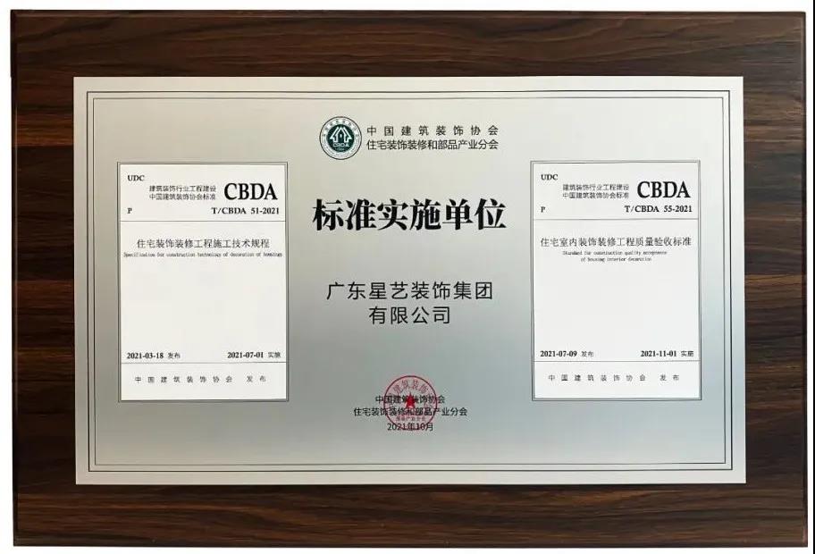 廣東星藝裝飾集團(tuán)入選建筑裝飾行業(yè)工程建設(shè)CBDA標(biāo)準(zhǔn)《住宅裝飾裝修工程施工技術(shù)規(guī)程》、CBDA標(biāo)準(zhǔn)《住宅室內(nèi)裝飾裝修工程質(zhì)量驗(yàn)收標(biāo)準(zhǔn)》標(biāo)準(zhǔn)實(shí)施單位