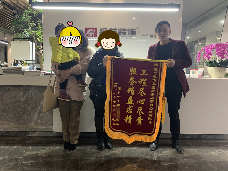 2019年1月22日,星藝裝飾南寧公司項目經(jīng)理黃張勇接受到榮和千千樹業(yè)主業(yè)主的表彰錦旗! 這不是星藝裝飾的第一面錦旗,但也肯定不是最后一面錦旗,紅艷艷的錦旗是星藝裝飾始終堅持顧客至上的服務(wù)理念的最好的回報,也是公司不斷發(fā)展、不斷壯大的強(qiáng)勁動力。我們將繼續(xù)堅持“把裝修交給我們,您放心上班去”的宗旨,全心全意為每一位客戶服務(wù),打造出更多的“放心工程”、“品質(zhì)工程”,來回報我們的客戶。