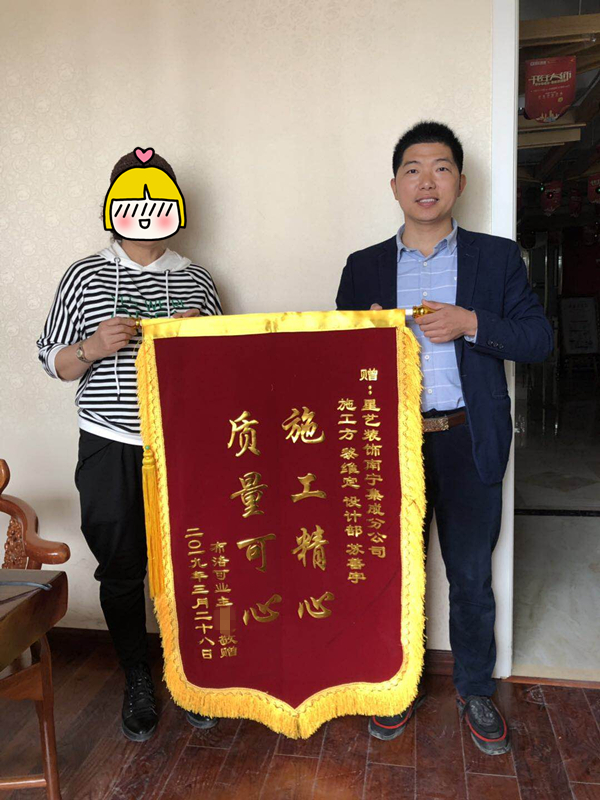 2019年3月28日,嘉和城布洛克業(yè)主為感謝項目經(jīng)理黎維定和設計師蘇善宇,專門贈送錦旗,錦旗內容:質量可心 施工精心 。星藝一直堅持做裝修等于做朋友的理念,不斷地從設計、材料、工程及管理方面進行創(chuàng)新、優(yōu)化,走在家裝行業(yè)的前列。