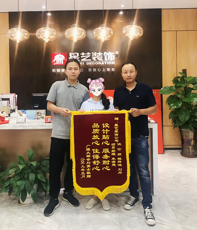 廣源大都會業(yè)主劉女士為感謝項目經(jīng)理朱澄建和設計師姚煒鴻、劉丹,專程來到星藝富安居設計中心送錦旗,感謝項目經(jīng)理和設計師的認真負責。錦旗內(nèi)容:品質(zhì)放心,設計放心,住得舒心,服務耐心。認真工作一定會獲得認可的,我們一定還會繼續(xù)努力提升自己的工作服務。