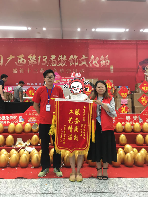 6月9日中國廣西第十三屆裝飾文化節(jié)(南寧站)現(xiàn)場云星華府業(yè)主送來錦旗,感謝設(shè)計師項目經(jīng)理,工藝精湛,服務(wù)周到。
