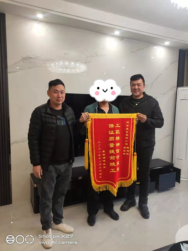 2021年11月27日。萊茵湖畔業(yè)主送來(lái)錦旗一幅,這位業(yè)主已經(jīng)是第三次找到星藝裝飾裝修了,項(xiàng)目經(jīng)理陳福勝、設(shè)計(jì)師周登峰和業(yè)主合影,錦旗內(nèi)容:工匠精神守契約,保證質(zhì)量提前竣工