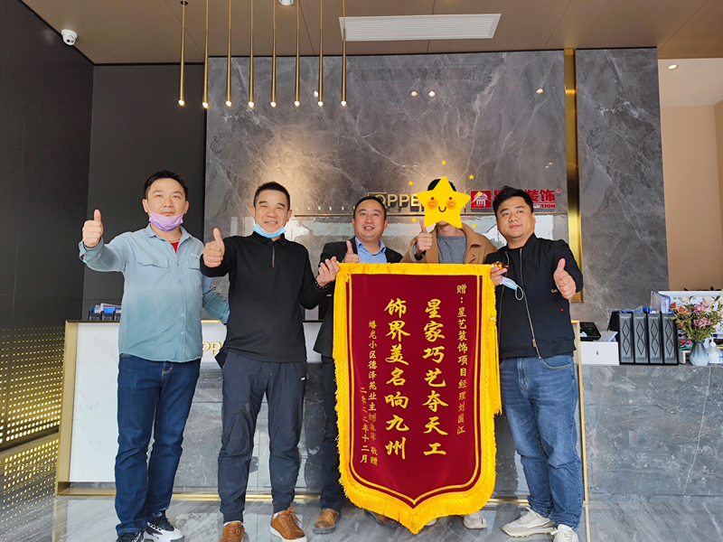2022年年底,蟠龍小區(qū)德澤苑業(yè)主劉先生來到星藝裝飾歐派整裝大家居館,附贈錦旗一幅,錦旗內(nèi)容:星家巧藝奪天工 飾界美名響九州 ,星藝集成整裝總經(jīng)理,項目經(jīng)理,設(shè)計師接受錦旗并與業(yè)主一起合影