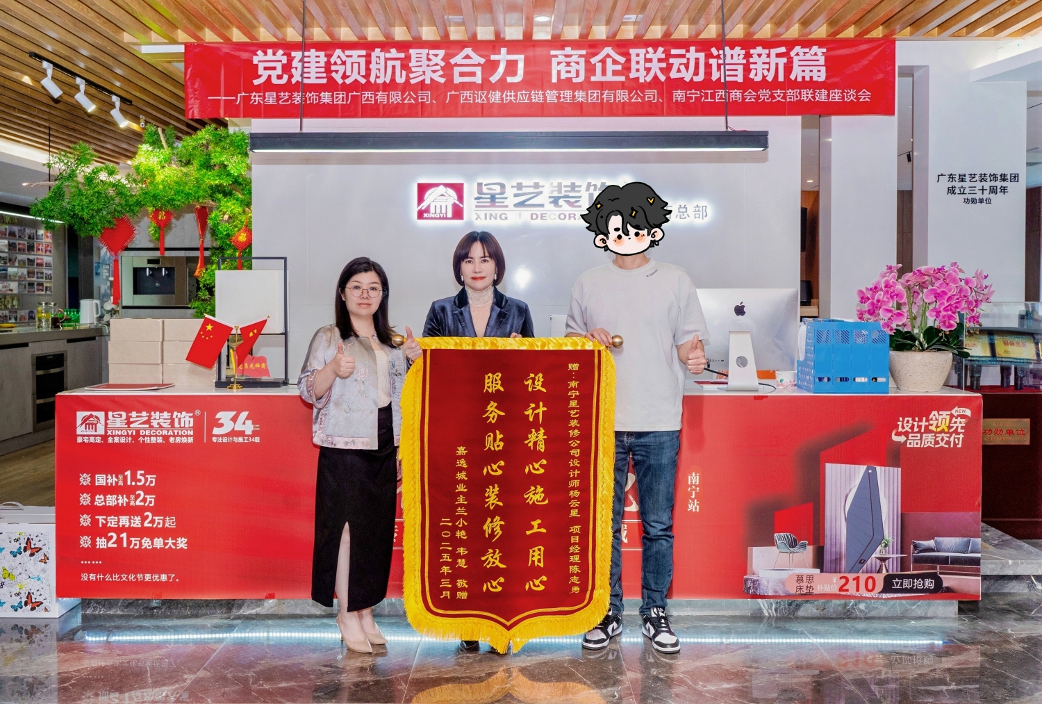 2025年4月13日,南寧星藝裝飾匯東旗艦店內(nèi)春意盎然,嘉逸城業(yè)主專程送來一面鐫刻著"服務(wù)貼心、裝修放心、設(shè)計(jì)精心、施工用心"十六字金言的錦旗。在歡聲笑語中,總監(jiān)設(shè)計(jì)師楊云星與業(yè)主執(zhí)旗合影,鎏金絲絨映照著雙方真摯的笑靨,定格了這場品質(zhì)與信任的雙向奔赴。
