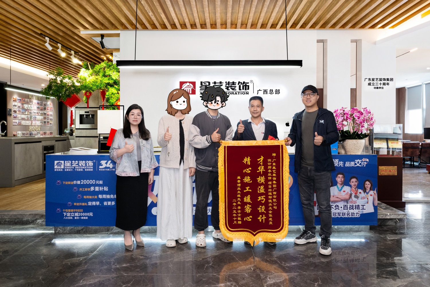 金秋送爽,贊譽隨行。2025年11月初,南寧招商雍景灣的業(yè)主親臨星藝裝飾匯東店,將一幅承載著滿滿認可與謝意的錦旗,鄭重交到了項目團隊手中。錦旗上,“精心施工暖客心,才華橫溢巧設計”十四個鎏金大字,不僅是對項目經(jīng)理鄒德水先生精湛工藝與細致管理的由衷贊嘆,也是對匯東設計部經(jīng)理謝麗萍女士卓越品味與創(chuàng)新構(gòu)思的高度嘉許。