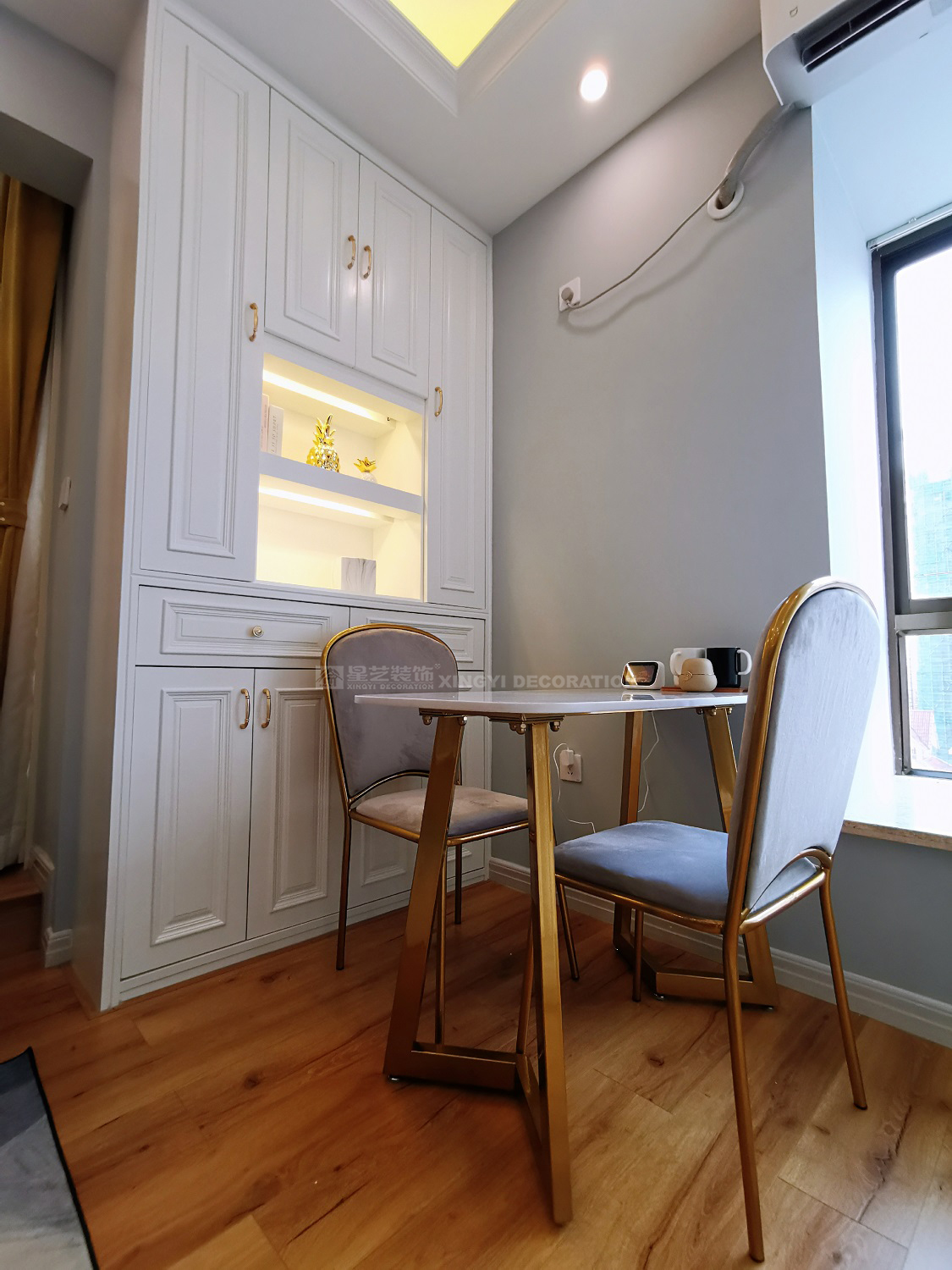 原本的結(jié)構(gòu)中是沒有獨(dú)立的餐廳空間,在這次改造中,專門為用餐劃分出一個(gè)區(qū)域,通往陽(yáng)臺(tái)的門進(jìn)行封閉,打造定制餐邊柜,增加空間收納設(shè)計(jì),擺上簡(jiǎn)單的雙人用餐桌,完美!