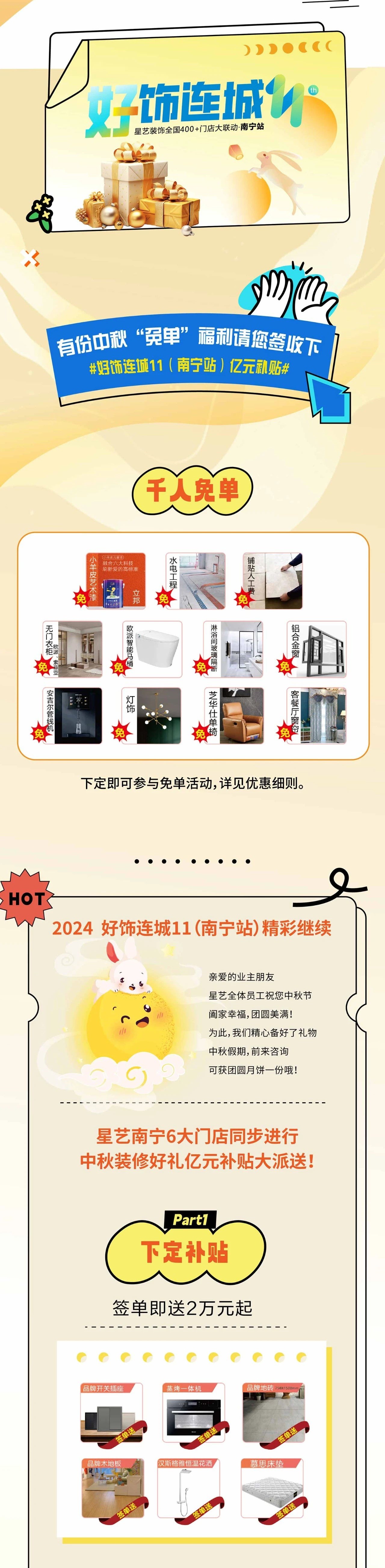 2014年星藝裝飾“好飾連城”全國大聯(lián)動首屆成功舉辦,一年一屆好飾不斷上演。星藝集團總部+歐派總部+一線集采品牌助陣聯(lián)合讓利。星藝裝飾33年品牌,入駐綠城22年,不負(fù)每一份信任。好飾連城11,11重禮遇、億元補貼、鉅惠全國。南寧站具體優(yōu)惠如下: