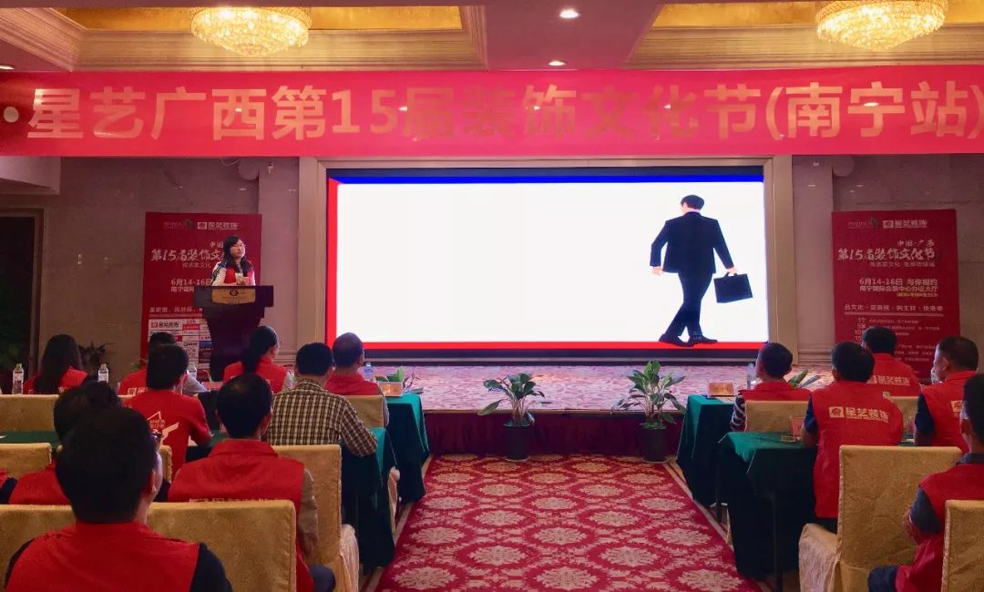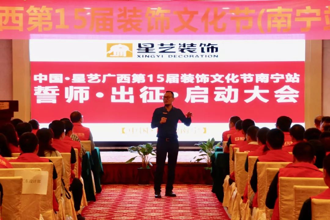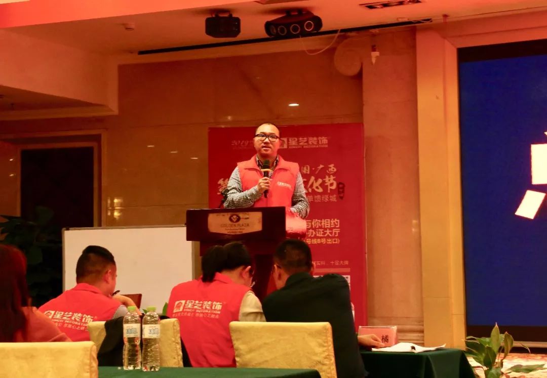 隨后,星藝南寧區(qū)域總監(jiān)李明上臺(tái)闡述十五屆裝飾文化節(jié)(南寧站)的策劃方案、優(yōu)惠細(xì)則、活動(dòng)推廣、獎(jiǎng)勵(lì)制度政策和方案,講解星藝九大家設(shè)計(jì)哲學(xué)思想、質(zhì)量和服務(wù)標(biāo)準(zhǔn)以及市場(chǎng)變化等。李工也不禁感慨萬千,從第一屆裝飾文化節(jié)延續(xù)至今全部參與了南寧的15屆,從第一屆的30單到十四的603單,把自已首屆簽8單的好成績(jī)放在今日相比,其實(shí)不算得什么,但這亦是證明了星藝一直在不斷強(qiáng)大,未來可期,勇攀高峰,相信在本屆裝飾文化節(jié)中,星藝家人們亦能取到更為耀眼的成績(jī),再次刷新2018年的記錄。