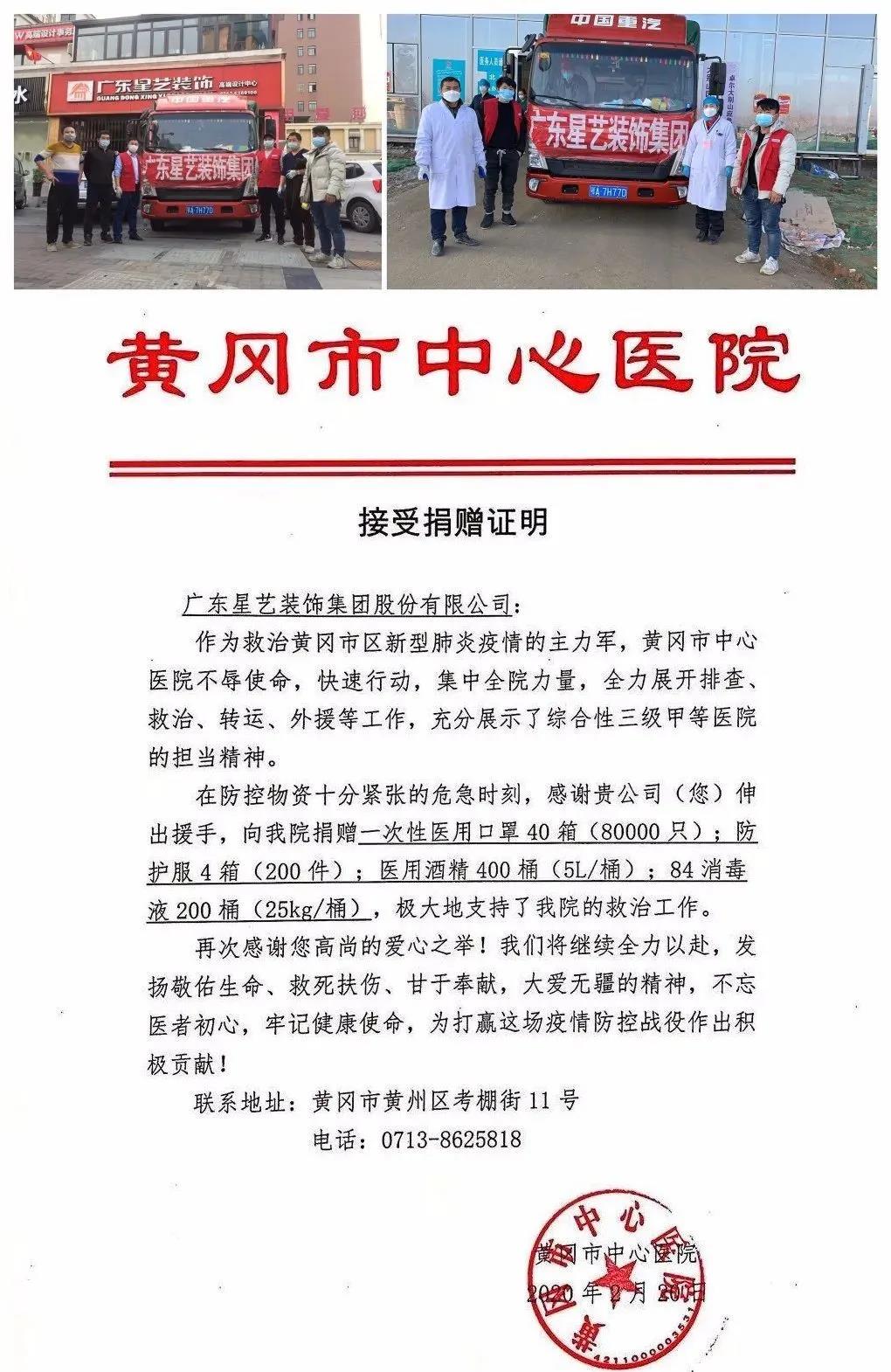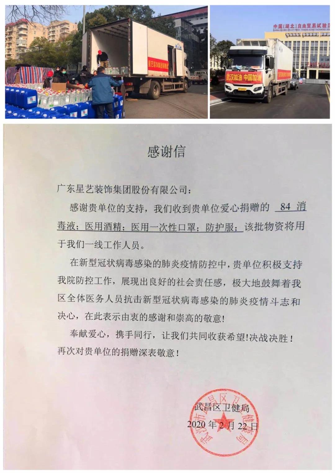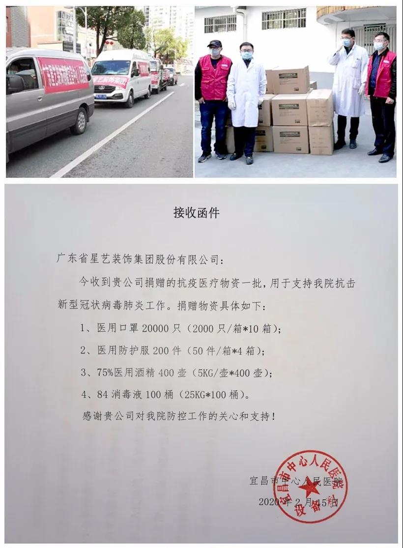 截至2月27日,星藝裝飾“愛心接龍”籌款共計220多萬元。22日前,通過湖北省慈善總會協調,愛心物資分三批向湖北宜昌、武漢、黃岡定向捐贈的醫(yī)用口罩、防護服、醫(yī)用酒精等愛心物資已經全部到位,將每份愛心落到實處。