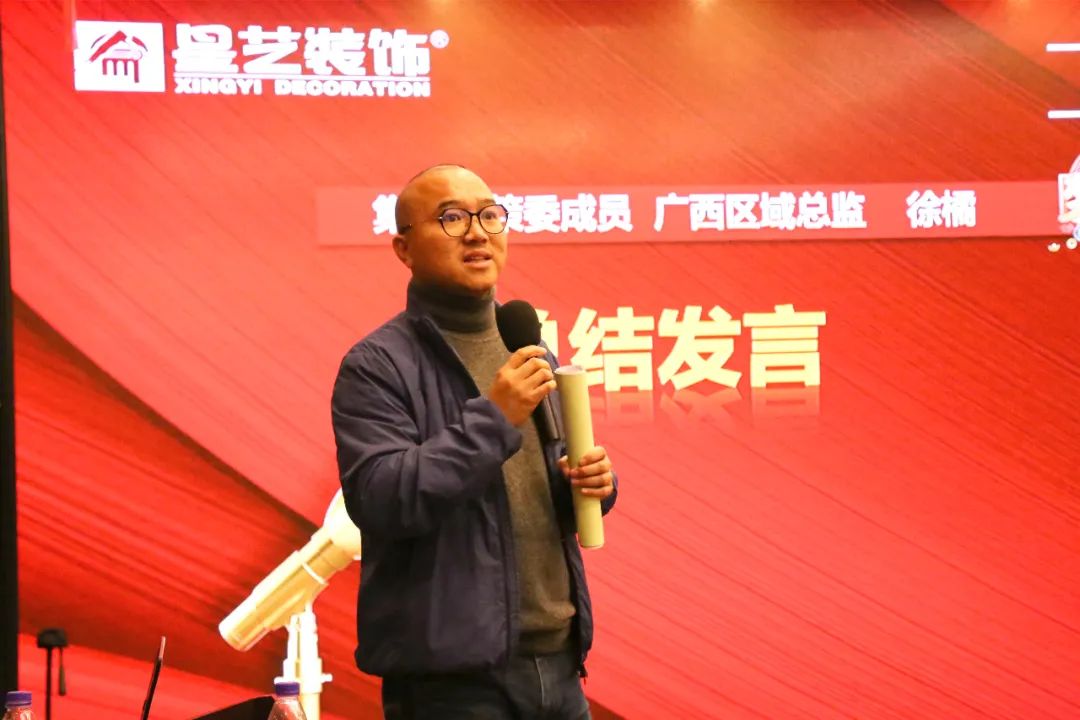 最后,集團決策委成員、廣西區(qū)域設計總監(jiān)徐橘做會議總結(jié),徐總先是以南寧裝修市場形勢做了簡要的分享,并結(jié)合自己去外地市場考察,見到一些新的東西,分享到“因為市場在變化,行業(yè)在變化,不管是工程部也好,營銷部、設計部也好,相互之間一定要懂得總結(jié)和復盤。”通過慢慢地去做一些市場的復盤,去解決細部節(jié)點的問題,保持活躍性,不斷調(diào)整自己的模式,從而打造出企業(yè)的共同目標。