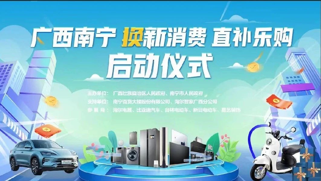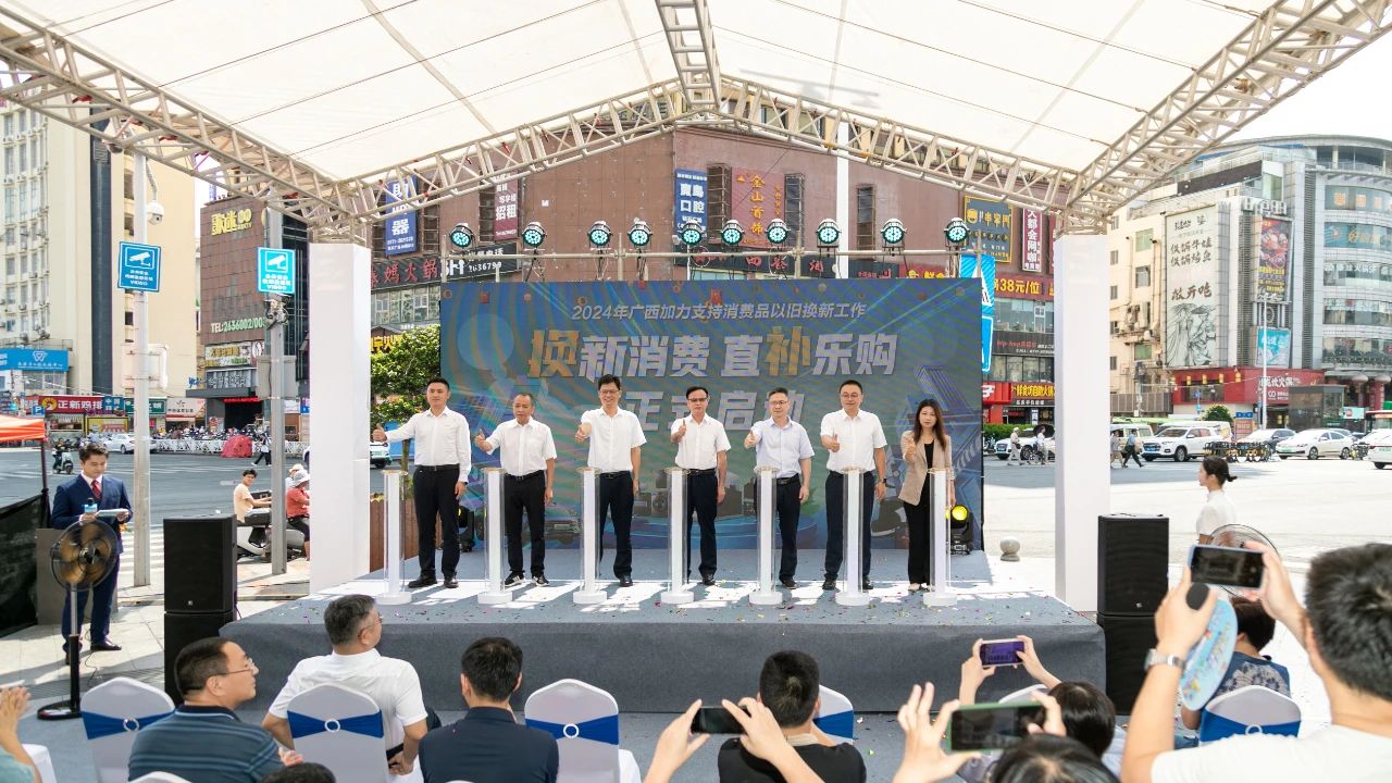 8月31日上午10時,由廣西自治區(qū)發(fā)展改革委、自治區(qū)商務(wù)廳、自治區(qū)交通運(yùn)輸廳、自治區(qū)農(nóng)業(yè)農(nóng)村廳聯(lián)合主辦;南寧市發(fā)展改革委承辦;海爾智家廣西分公司、南寧百貨大樓股份有限公司聯(lián)合協(xié)辦;2024年廣西加力支持消費(fèi)品以舊換新工作啟動儀式在南寧百貨大樓小廣場(朝陽路門店)隆重舉行。