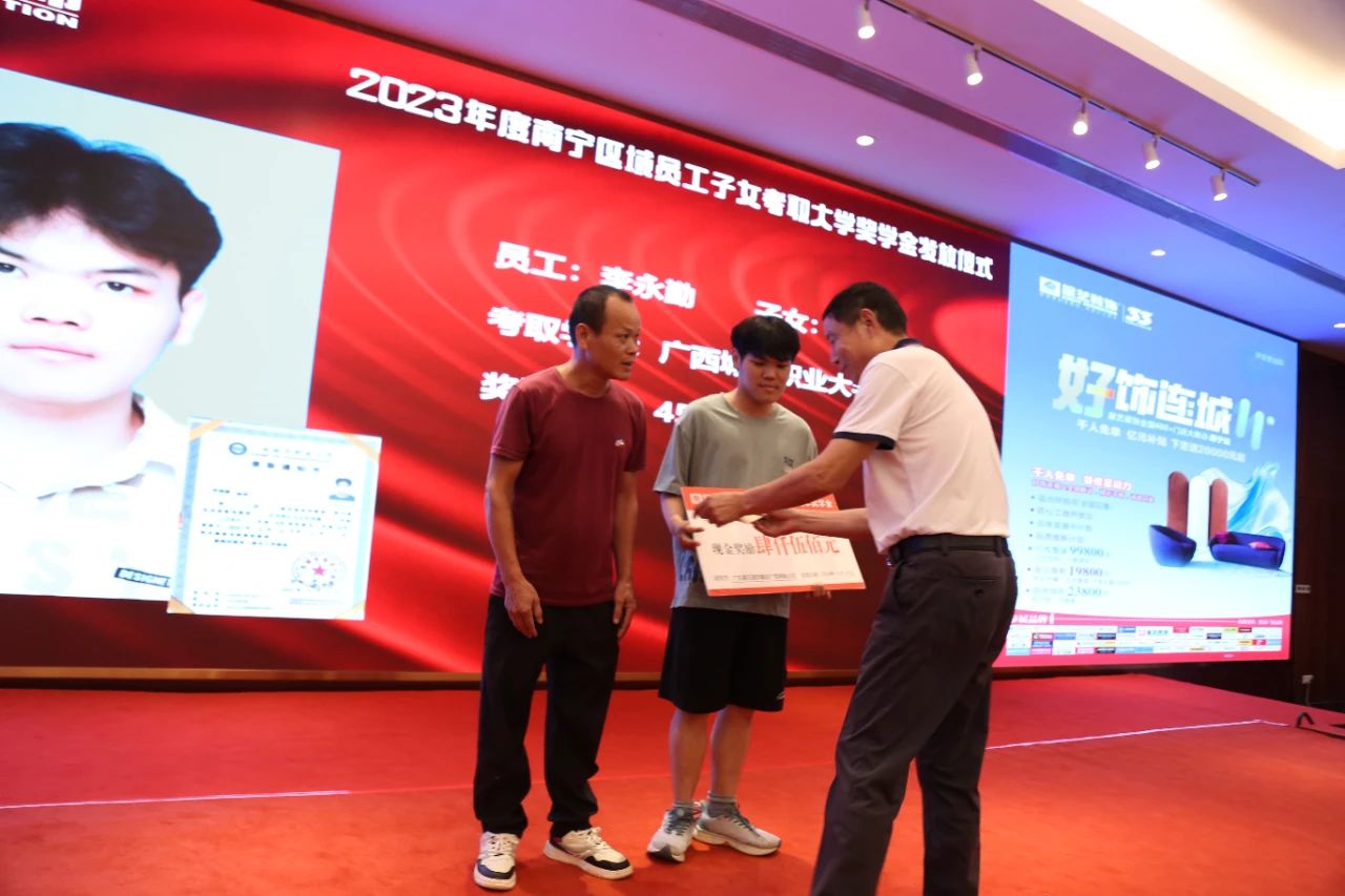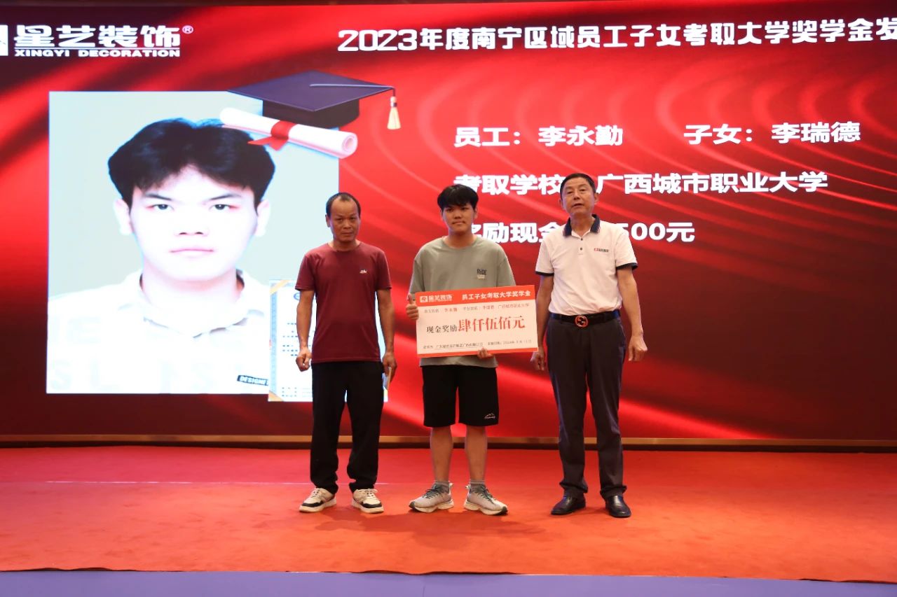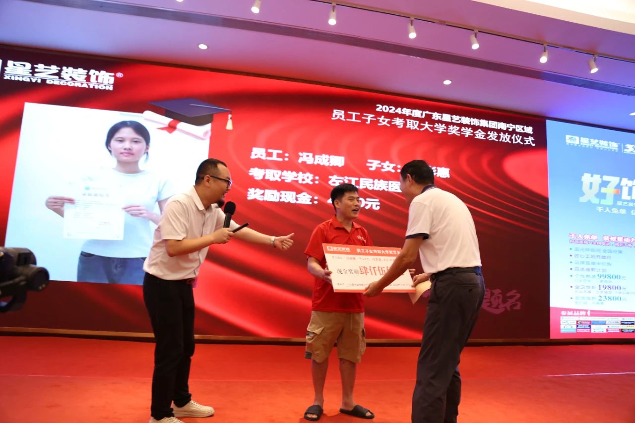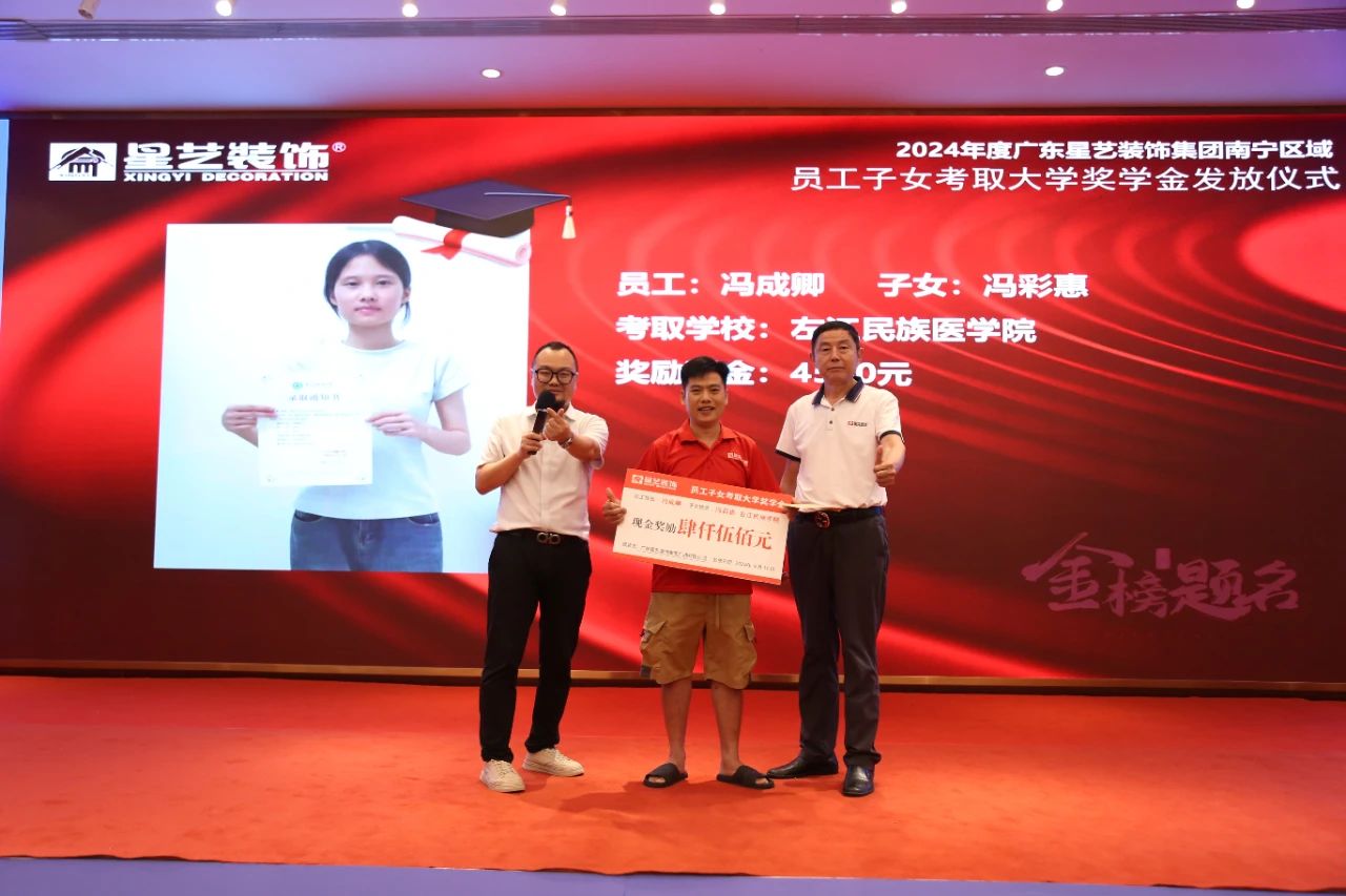 9月10日,在“好飾連城11(南寧站)”啟動(dòng)會(huì)上,2024年度星藝南寧區(qū)域員工子女大學(xué)獎(jiǎng)學(xué)金發(fā)放儀式隆重舉行。在四百多名星藝南寧區(qū)域家人的見證下,星藝南寧區(qū)域總經(jīng)理周平生為星藝員工李永勤、馮成卿兩位考上大學(xué)的子女頒發(fā)星藝獎(jiǎng)學(xué)金,以此關(guān)愛員工,鼓勵(lì)“星二代”們,奮發(fā)向上,努力學(xué)習(xí),成為社會(huì)有用之材。