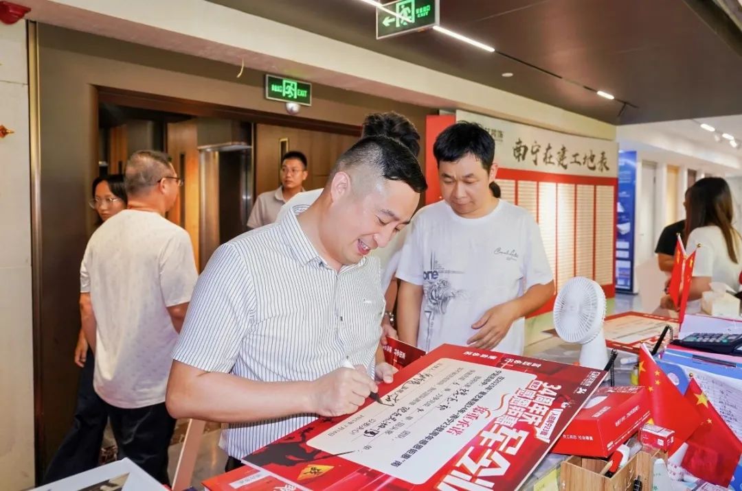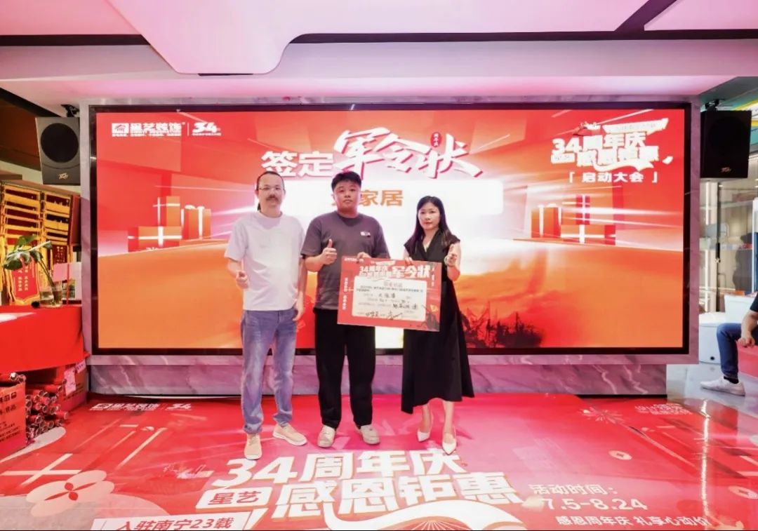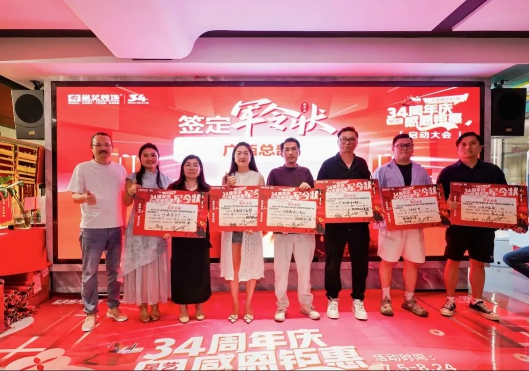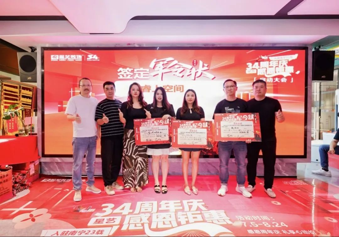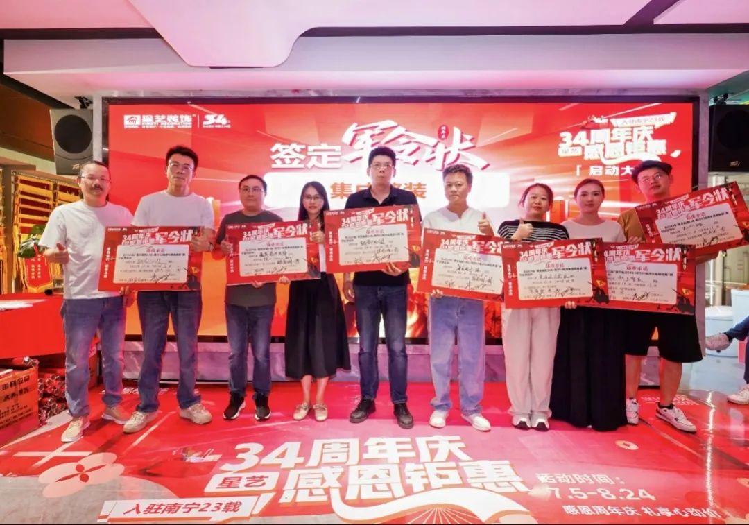 隨著現(xiàn)場(chǎng)氣氛逐漸高漲,會(huì)議進(jìn)入星藝集團(tuán)34周年慶活動(dòng)啟動(dòng)環(huán)節(jié),星藝南寧門店負(fù)責(zé)人、設(shè)計(jì)師、經(jīng)理等紛紛與周總、李工、胡總簽訂“軍令狀”,誓既出,必達(dá)成,新的征途正式啟動(dòng)。