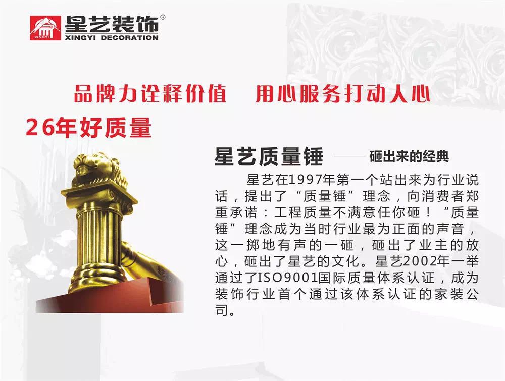 星藝裝飾1991年創(chuàng)立于廣州,2002年入駐廣西,“誠信正直,勇于奉獻(xiàn)”是星藝人一直所追求的精神。星藝裝飾始終秉持“健康家居,品質(zhì)生活”的經(jīng)營理念,無論是首推全國聯(lián)保、“質(zhì)量錘”宣言,還是工藝精研、人才培養(yǎng),這無一不彰顯出星藝“客戶贊許”的企業(yè)價(jià)值觀。正如我們所踐行“把裝修交給我們,您放心上班去”的承諾一樣,高舉“誠信裝修”大旗,用品質(zhì)為愛筑巢。